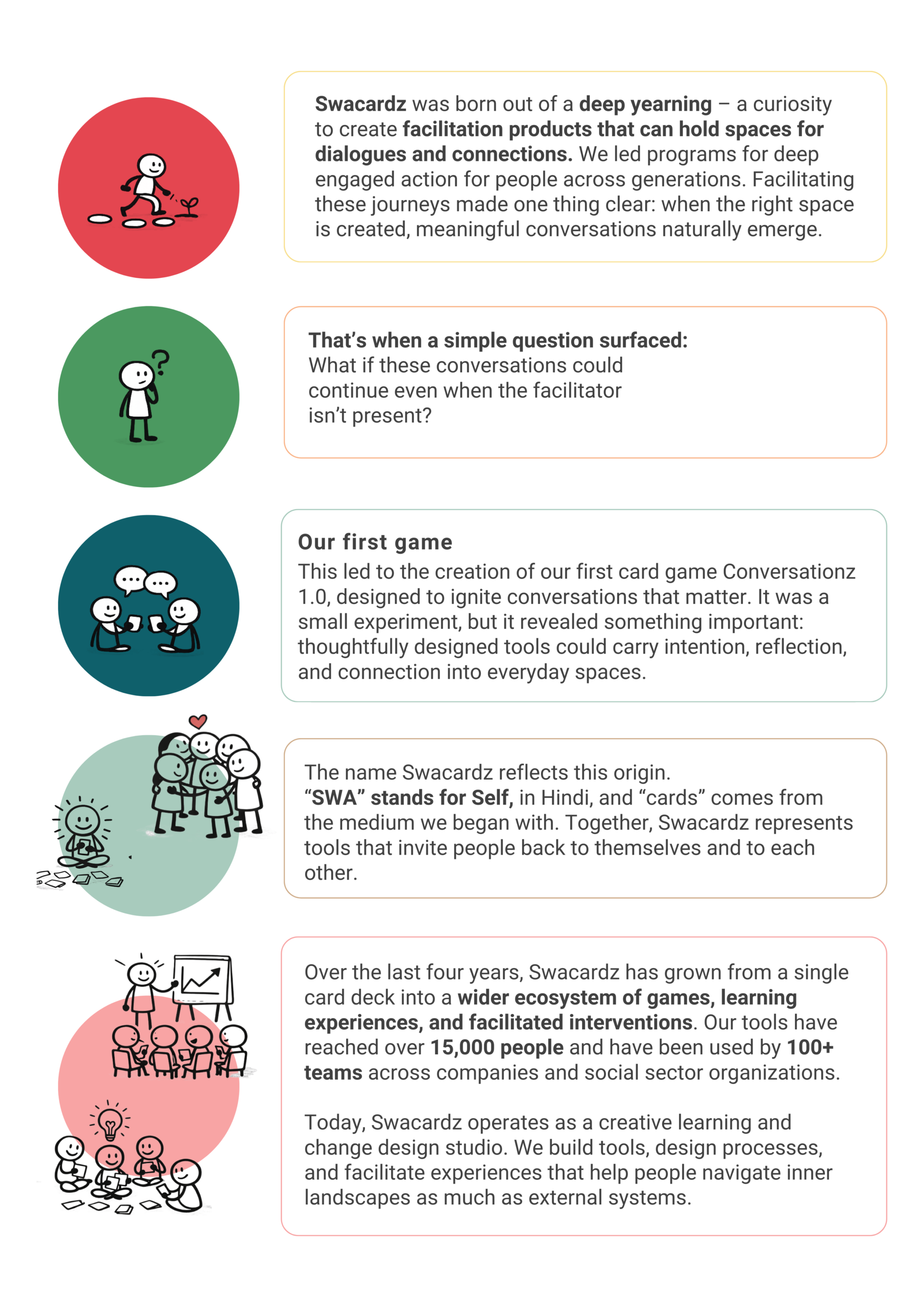 Over the last four years, Swacardz has grown from a single card deck into a wider ecosystem of games, learning experiences, and facilitated interventions. Our tools have reached over 15,000 people and have been used by 50+ teams across companies and social sector organizations.