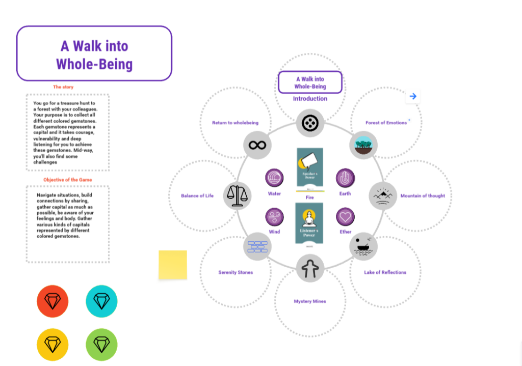 A team game to cross multiple trechearous landscapes and scenarios that help the participants find their socio-emotional anchor and strive for their personal and team wellbeing. (Co-designed with Madhur Anand)